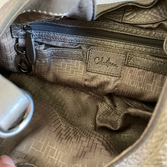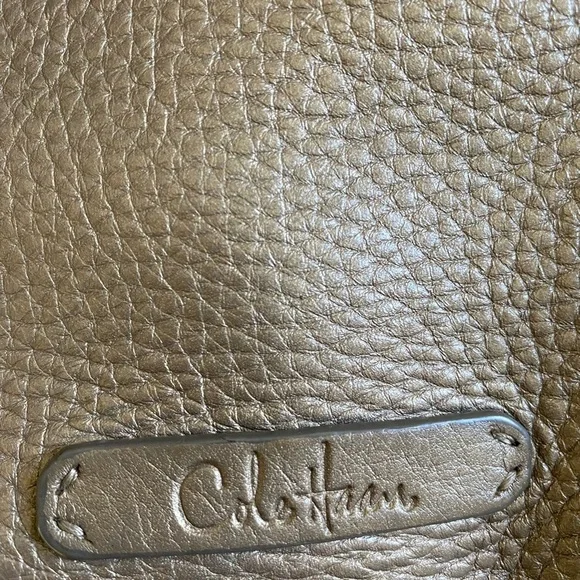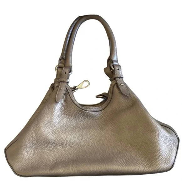 This is a pre-owned Cole Haan handbag made of pebbled leather in a silver tone. It features a single top handle with a silver tone buckle closure. The bag has a spacious interior with a zippered pocket and a small open pocket. The bag measures approximately 12 inches wide, 10 inches tall, and 4 inches deep. The bag is in good condition, fully functional, and ready to be enjoyed.