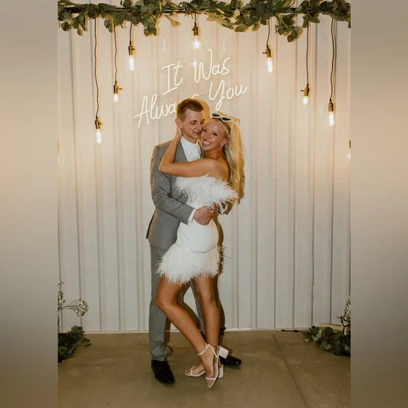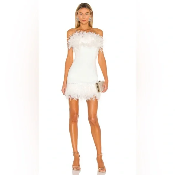Bronx and Banco Lola Blanc mini feather dress in white. EUC, worn for a couple hours as wedding reception party dress & professionally dry cleaned afterFeatures: fully lined, exposed back zipper closure, boned bodice, midweight crepe fabric with ostrich feather trimNeckline to hem measures approx 24” in length according to listing + additional coverage from feathersBridal wedding engagement party mini dress